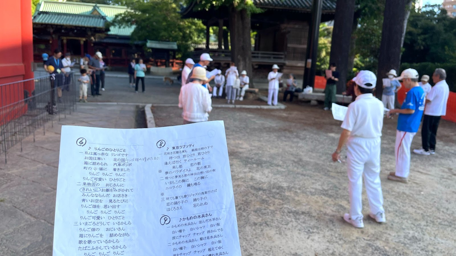 小林さんは、根津の生活について「住みやすいし、近所の人たちが親戚みたいにみんな優しい」と語り、「埼玉に住む子どもたちのところもいいが、やっぱり、この根津の地で暮らすのが一番だ」と言う。ラジオ体操の場でも、多くの知り合いと交流し、仲間と連れ立っておしゃべりしながら帰宅するのも楽しみの一つだそうだ。体操の後には、この場に15〜20人ほどが残って、童謡や昭和歌謡などを合唱する時間がある。この日も、会員の皆さんと一緒に懐かしい歌を楽しんだ。歌うことは認知症の予防にも効果があるのだとか。