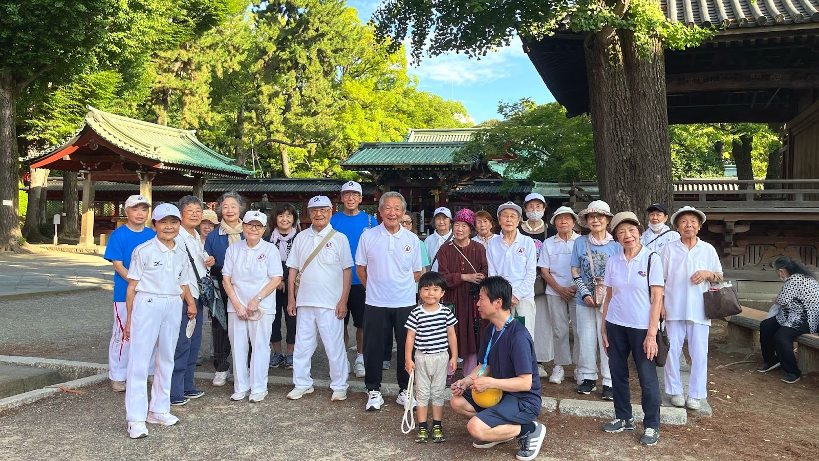根津神社で行なわれているラジオ体操は、文京区ラジオ体操連盟の指導のもと、年中無休で実施されている。2020年のコロナ禍で緊急事態宣言が出た時期を除けば、ほぼ毎日続けられてきた。NHKの本放送が始まる5分前、午前6時25分から準備体操が始まる。このラジオ体操会を長年牽引しているのが、会長の田口時男さん。現在87歳でありながら、25年以上も毎朝欠かさず参加している。雨の日も神社の大きな門や手水舎の屋根の下など、雨が当たらない場所で体操を続けてきた。参加者は毎日100名を超え、多い時には120名ほどになる。ラジオ体操はいつでも誰でも自由に参加できるが、この体操会には「会員制度」もある。会員になると、お正月には参加者の1年間の安全を願うお祓いが行われ、お酒が振る舞われたり、“根津神社ラジオ体操会”と書かれた特製オリジナルタオルがもらえたりする。会長さんや会員の方に声をかけてもらえれば、会計係りの方が申込書をくれるので、記入したのち年会費1000円を支払うと会員になれる。会の運営の方々は白いユニフォームと胸のエンブレムが目印!