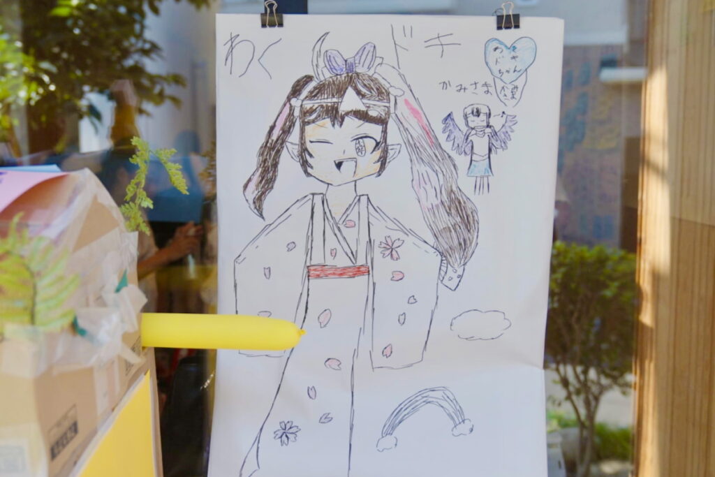 「遊ぶの大好き神さま ワクドキ」もほかの子と協力して描きあげ、とてもキュートな神さまが誕生。「ごちゃまぜまつり」の幕や提灯といった飾りもつくられて、お祭りの雰囲気も出来上がってきた。